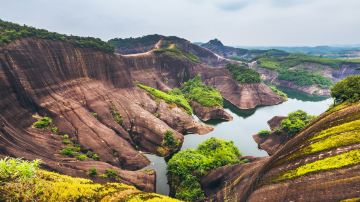 高椅岭以山林为主,山脚碧水环绕,从高处俯瞰犹如墨绿色的“天池”环绕着一只在水面张牙舞爪的“八爪鱼”。这里丹峰林立、红崖绿水,美得一塌糊涂,山、水、泉、洞、寨、崖、坦俱全,是一处不可多得的丹霞地貌奇观。