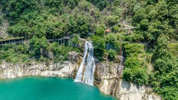 猴古山瀑布地势陡峭,水流湍急且落差大,撞击石壁后落入水潭里,非常壮观。